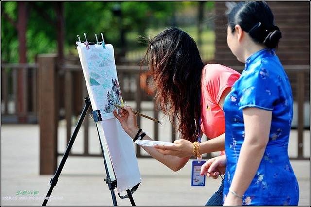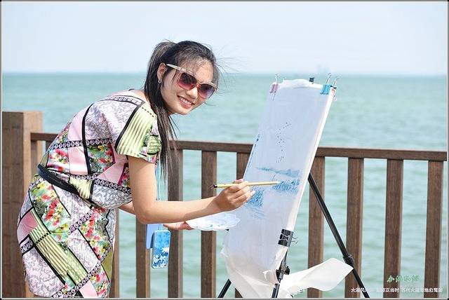 串好了核雕,大家来到了湖边,太湖烟波浩渺,清风拂面!这里,早已支起了画架,来自郁舍的农民画家要在这里教我们画画,其实就是给半成品画作上色,都是些写意画,简单的几笔深浅墨色便勾勒出了太湖的各种山水,相当传神。至于色彩,就靠大家发挥想象力了。大家兴致高涨,在老师的指导下,还真有几幅看起来相当不错!
