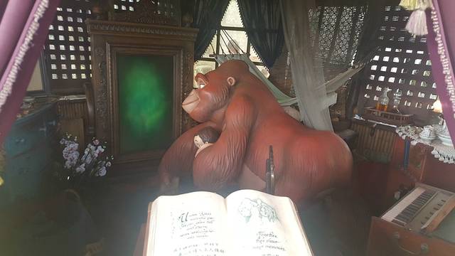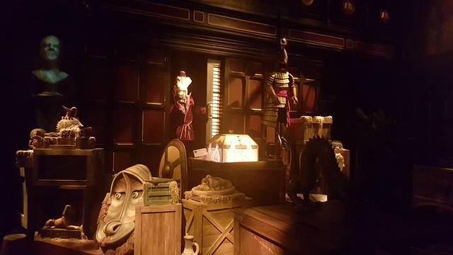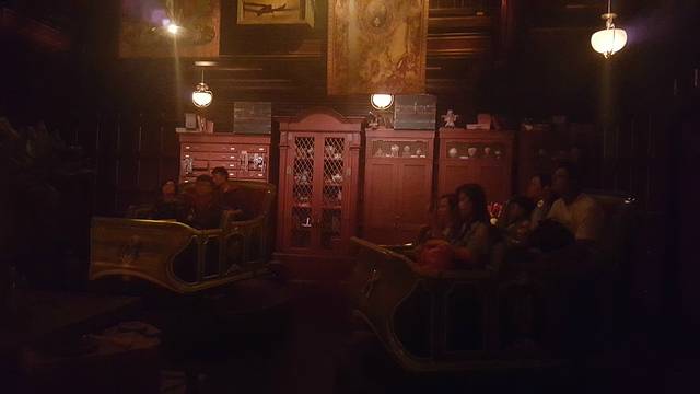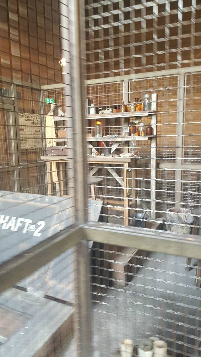 从灰熊山谷出来就是迷离庄园,去迷离庄园是进了一个大庄园,里边有一些展览然后就看了一个短剧介绍,我们还以为就完了呢,觉得特别坑爹,但是没想到,后边还有一个磁浮列车,32辆载人列车同时出发,随机移动,按不同路线随机在“迷离庄园”内穿梭,再配合3D视觉效果和配乐,5分钟行程当中,感受惊吓及恐怖的视觉效果。