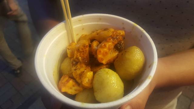 逛累了就回酒店休息一下,晚上再出去觅食,酒店旁就是一好哥们极力推荐的辉记小食,说她家的鱼蛋特别好吃,正好我们住的酒店离这里走路也就3分钟,索性就先吃一点垫补儿一口,这家店就在马路旁,主要卖鱼蛋和牛杂,还有鱿鱼,我认为鱼蛋和牛杂特别好吃。