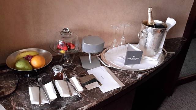 没一会就到酒店了,回酒店歇一会,喝点东西,准备晚上去吃夜宵,没想到回酒店的房间后,酒店还给我们准备了一个小惊喜,因为之前说到了想免费升级房型,但是未批准,我就没在想这事,但是回到酒店后,却发现,洲际额外赠送给我们一瓶法国香槟,这真是意外的惊喜。