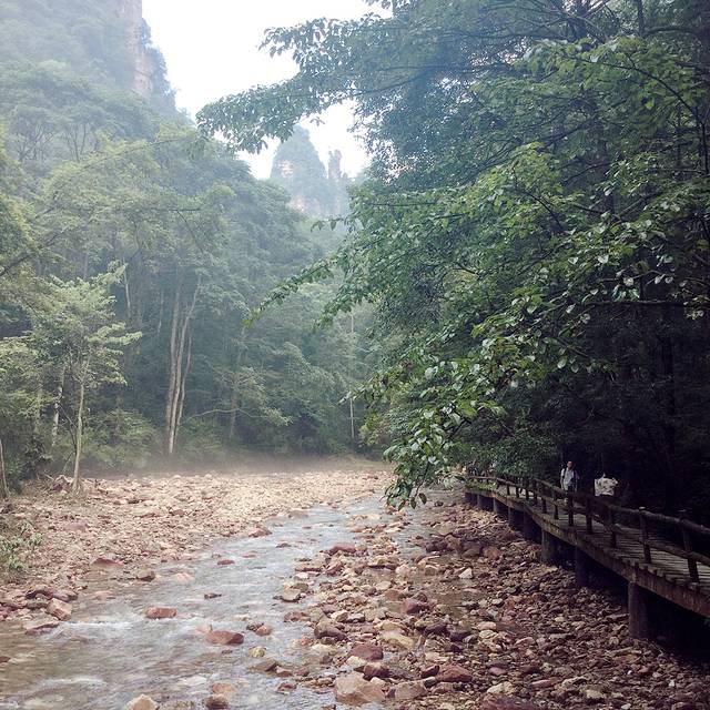 早上去还带点雾蒙蒙的,用我同学的话就是总感觉远处会有个仙人飘来~哈哈,而且早上走金鞭溪的人也少,能享得不少清净(之后你们便知道这清净多难能可贵了)