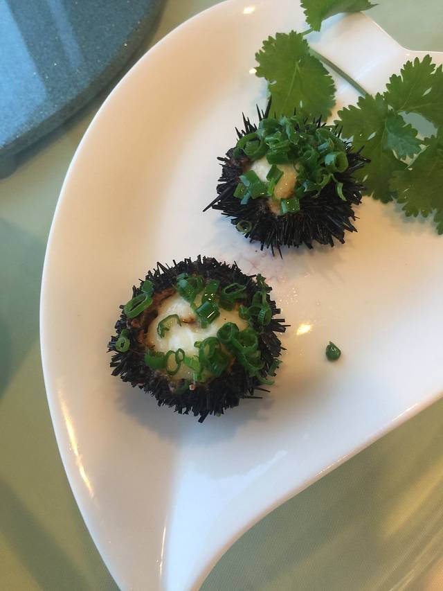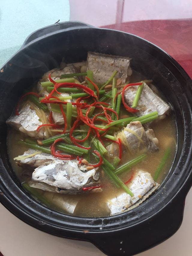 午餐只点了两个菜,一个海胆豆腐,一个豆酱煮带鱼。带鱼是昨晚就看上了,今天的依旧是一身白鳞,银光灿灿,极为完整。配着无敌海景,只有一个字“爽”!