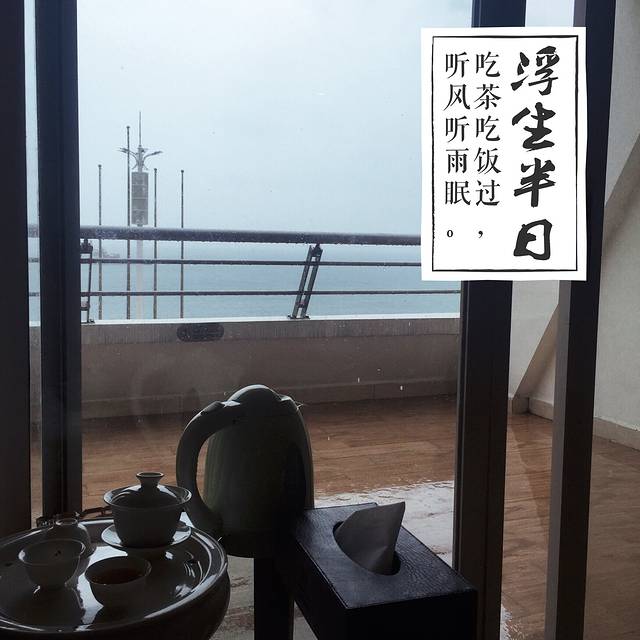 早上继续喝茶观海,雨时下时停,风渐渐小了。