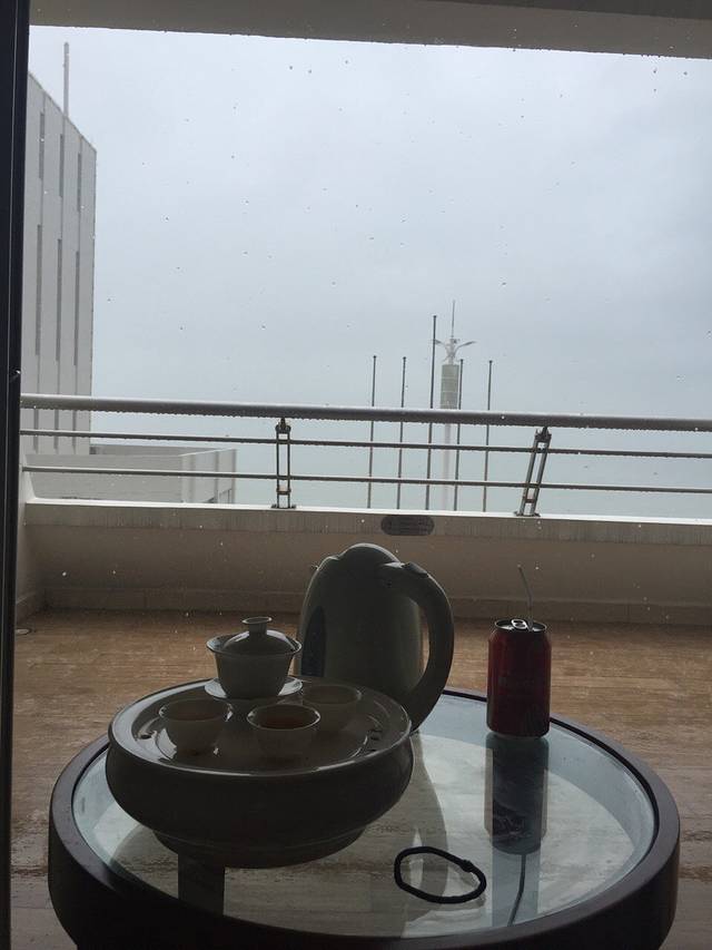 中午时分,终于如愿搬到了海景房。🌀的威力也开始渐渐显现,下起了大雨,我在屋内泡起单枞,享受半日清闲。浪还没起,海面依旧平静。