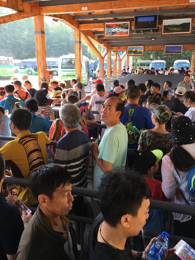 正常是7点开门,但现在是高峰期,提前到6:30开门,我6点到达西坡门口,已经有好多人在排队了。在排队的过程中,会有人过来问需要包车不,350元一位,可以不需要排队,在开门后第一时间,第一辆车上到天池,我感觉没有必要,所以之间忽略了。开始售票后的速度不是很快,因为我就一个人,所以买票,检票很快就过了。210元门票,包括85元的环保车票,不限次数乘坐。因为我去的还是比较早的,所以坐车基本没怎么排队,很快就上车了。