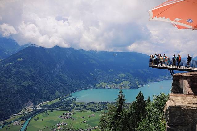 因特拉肯著名的观景台之一,海拔1322米。从东因特拉肯出发步行前往哈德铁路,乘坐索道缆车funicular穿过前往哈德山顶。上行只需要8分钟,由于整个路途地势险恶,一半的路都走在人工建造的桥上。抵达三角形平台,可以看到Thun湖和Brienz湖。