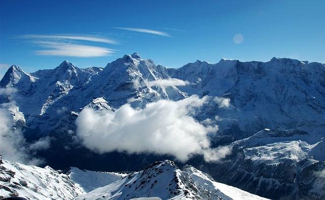 因特拉肯观景台之一。乘坐具有100多年历史的小火车抵达山顶,位于因特拉肯南边,东边是少女峰。上米伦,雪朗峰的缆车起点。通常是滑翔伞的降落点。这里的缆车站也是007拍摄场景之一。