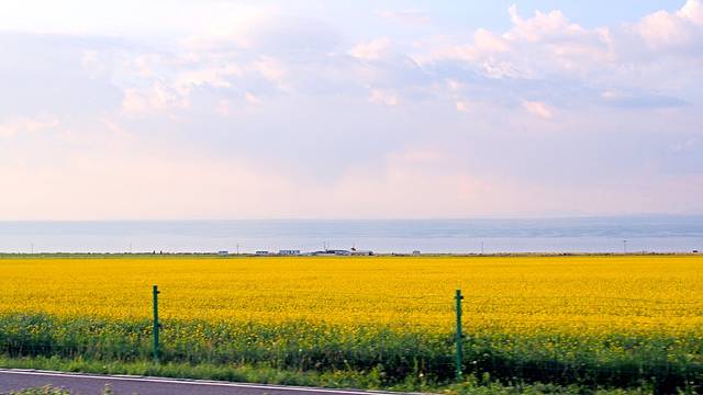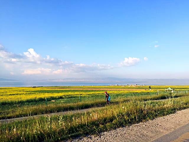 大片的油菜花映衬美丽的青海湖,只能说震撼~远远的望去,湖面就像在天上一样,水天相接~