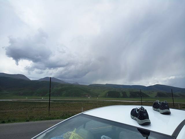 土豪先生的鞋在茶卡湿了后,一直没有干!!所以只要停车他就开始在车顶晒鞋~结果我们已经出发走了一段路了,土豪夫妇才开始狂喊“鞋鞋鞋”.......请脑补一辆车在山间穿越,车顶晒双鞋~