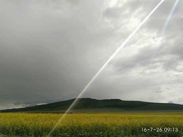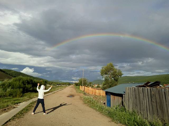 四五点到莫尔道嘎镇,可能是太累,我们在这个旅馆休息了一下。旅馆在路边,大约六点多突然外面传来一整惊叹声,“好漂亮呀”。带着好奇闻声出去,好美的彩虹🌈