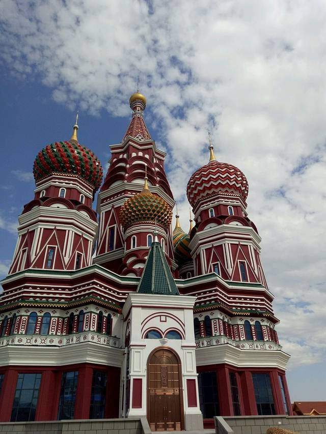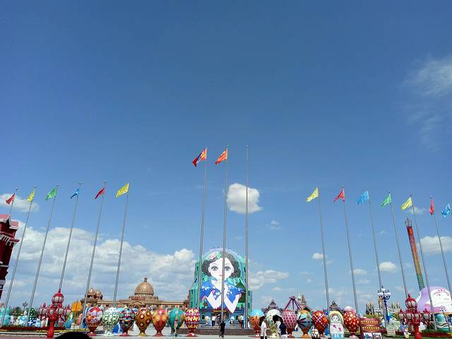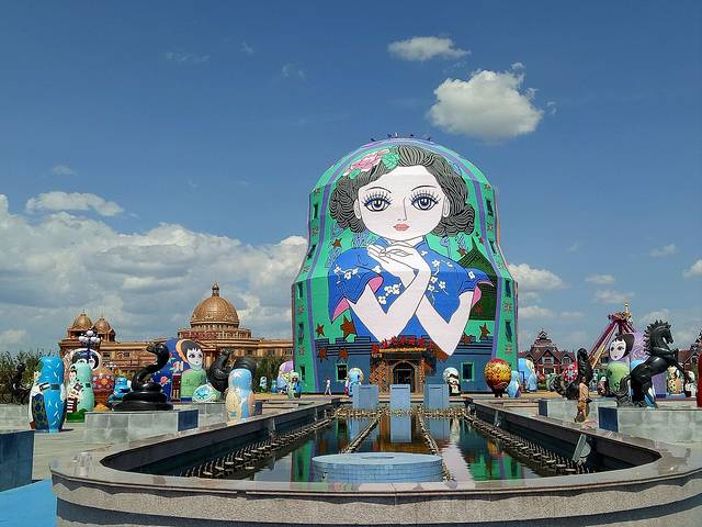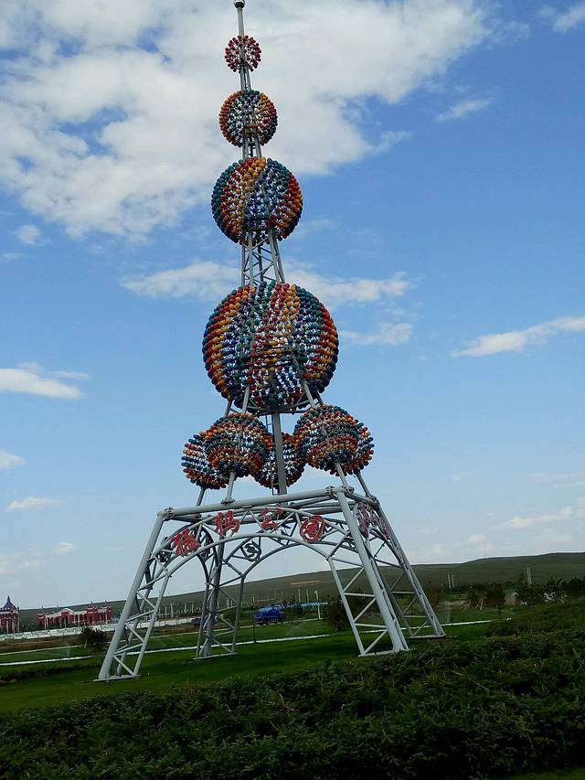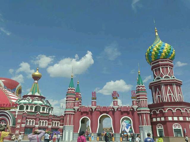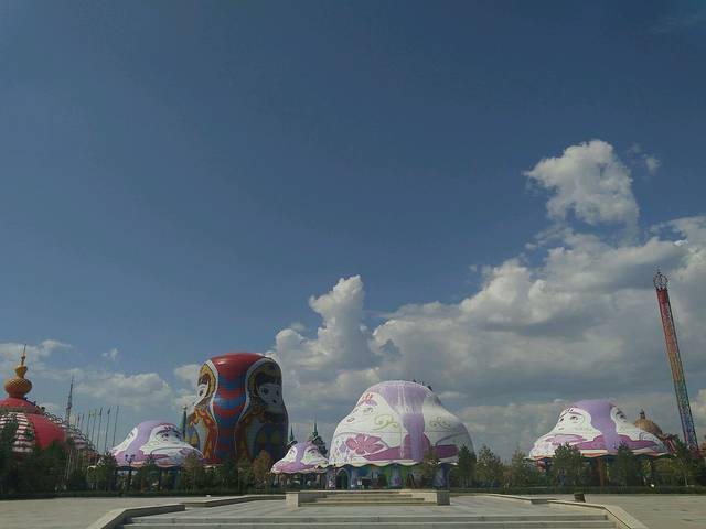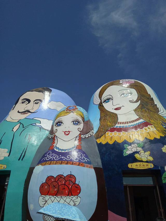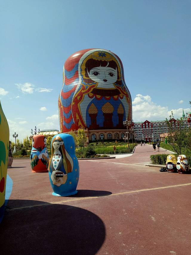 广场中心,有一个高大的套娃,即主题套娃,绕其转圈,可发现有三个面:一位蒙古姑娘,一位汉族姑娘和一位俄罗斯姑娘,寓意着蒙俄中三国和谐相处。这个主题套娃不但是一个俄罗斯套娃教堂,还是一个大型的西餐厅。四周的八个功能套娃,是八个风格浓郁的套娃商店,里面有各式各样的套娃近百种,还有套娃装饰品。其他的192个套娃是功能套娃的1/8,上画有色彩斑斓的图案,非常值得观赏。再外围还有喷泉,再配上彩色的霓虹灯,非常美丽。
