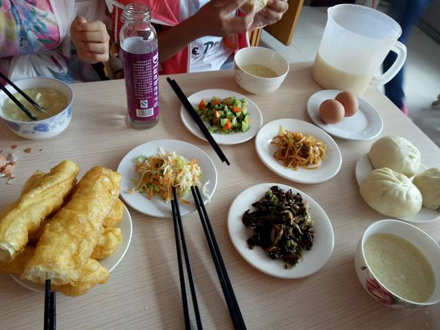 丰盛的早餐,可惜我感冒了,就喝了粥和吃了面包。