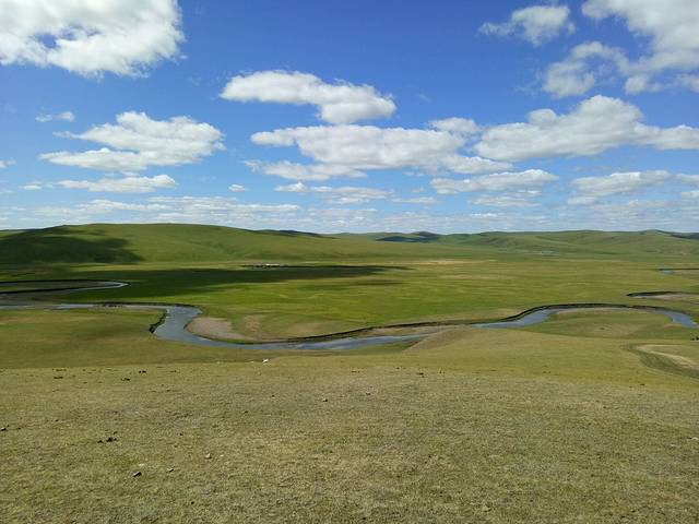 不愧是老舍笔下的天下第一曲水,蜿蜿蜒蜒的河水,就象是一条被劲风舞动着的蔚蓝色绸带,悠然飘落在碧绿如玉平坦无垠的大草原上!只有站在最高处,方能欣赏她的动心动情之美。