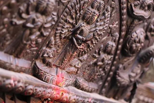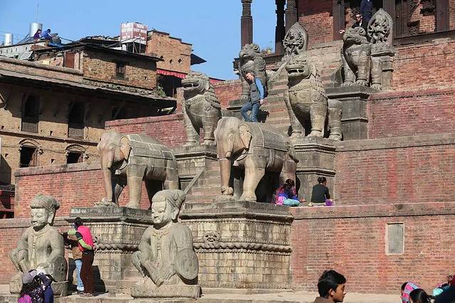尼亚塔波拉神庙最有名的当属五层基座上各放置左右的五对巨大石刻,由下而上依次是金刚力士、大象、狮子、鹰和女神。金刚力士拥有常人十倍的力量,从它向上的雕刻均以十倍的神力递增着,直到庙内的吉祥天女。由此可见,这座最高的神庙居然在尼泊尔的数次大地震中均未受到大的损伤,实在是受了很多神力的叠加保护吧。