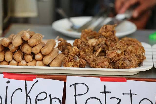 油炸鸡腿和火腿肠。