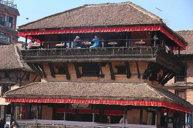 巴德冈最有名的尼亚塔波拉餐厅,它的前身是座传统的宝塔式庙,后被地震毁坏重建改成了CAFE餐厅。走上餐厅三层,在靠近阳台的位置坐下,悠闲自在地俯瞰着广场上千年前的风景与千年后的人流,油生一种君临天下、淡看人生的感慨。