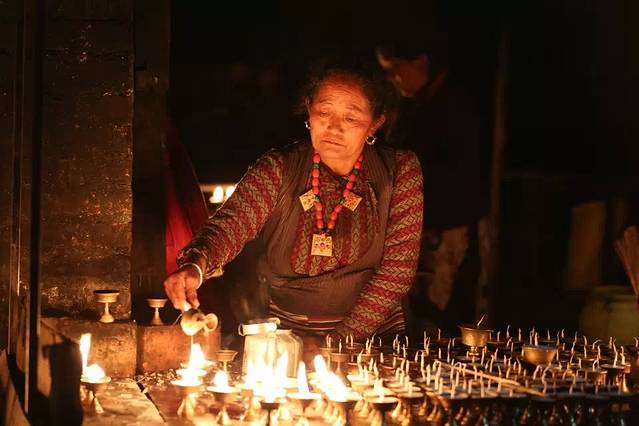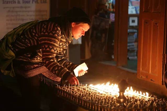 点酥油灯的信徒中,不乏外国游客,不管是出于信仰还是好奇,他们点油灯时眼里的认真和虔诚一点也不亚于藏民信徒。