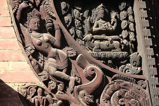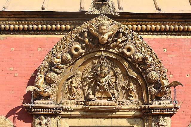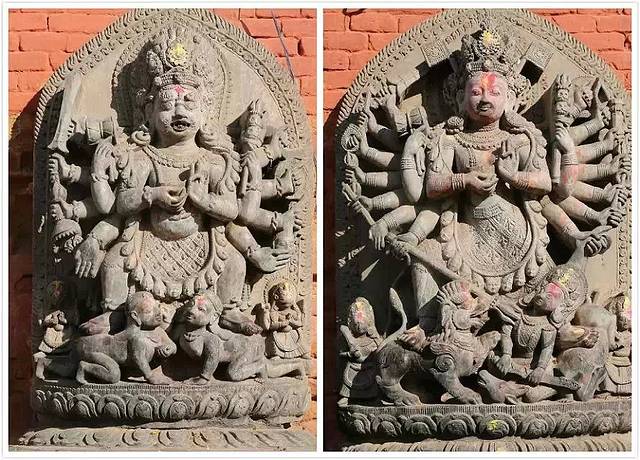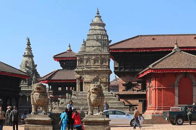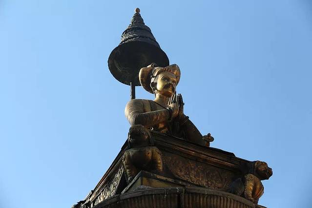 杜迦女神庙前石柱上是尼泊尔历史上最著名的国王布彭德拉.马拉的铜像,与加德满都和帕坦杜巴广场上的石柱像如出一辙。