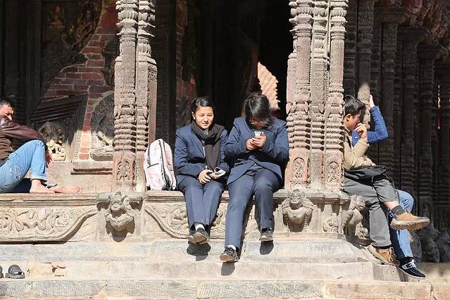 坐在石雕围栏上晒太阳、玩手机的尼泊尔学生美眉。
