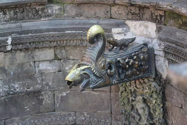黄金门内最值得欣赏的是塔莱珠神庙入口的木雕,纤毫毕现、巧夺天工的雕刻技艺令人叹为观止,遗憾的是严禁拍照。执行禁令的可不是稻草人般的管理员,而是荷枪实弹的士兵,还偏偏是忠于职守、毫不懈怠的那种,哈哈,我想表达什么意思,你懂得!这个内院唯一能拍还值得一拍的就是娜迦水池里的这个水龙头,鳄鱼正在吞噬一只山羊,羊头露在外面,水流从羊口倾泻而出。