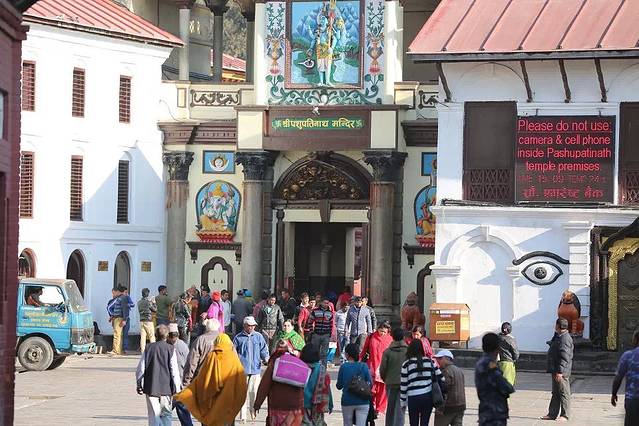 帕斯帕提那神庙(Pashupatinath)前的广场。在寺庙附近的巴哥马蒂河畔,坐落着尼泊尔最大的火葬场阿里雅火葬台(Arya Ghat),所以很多游记里都习惯简称它“烧尸庙”。