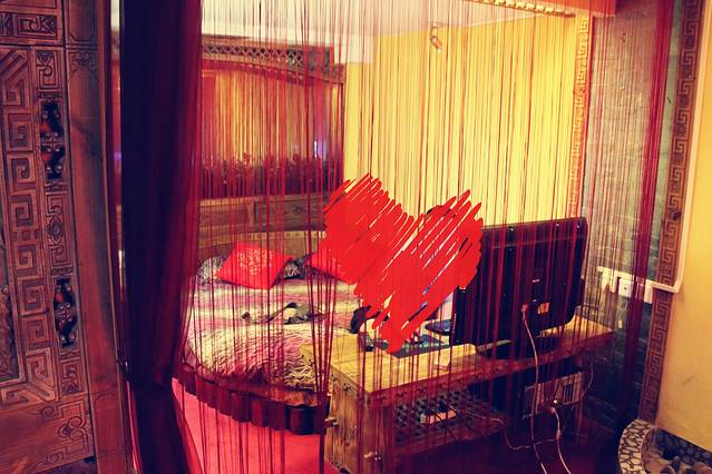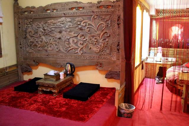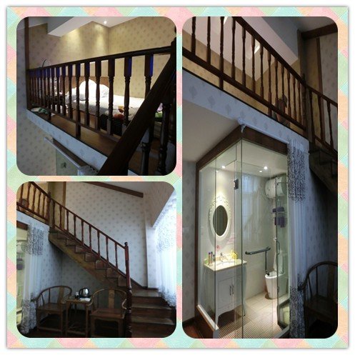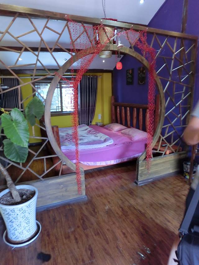优点也有,各个房间名字有特点,都是古代大美女的名字,比如我们住的是苏妲己、还有陈圆圆、西施、王昭君等等,有意思~~每个房间的面积够大!床也大!装修风格古色古香的,后面还有一条小河