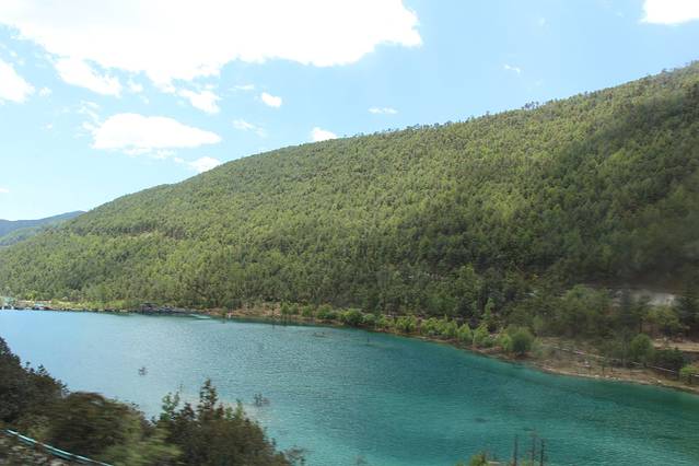 雪山快线上拍的蓝月谷,绕了一圈车开走了我们原以为不在这里停呢!嗨原来是去电瓶车那里,我们报的这个不含,也没必要做电瓶车,多交五十元不说看的东西是一样的,你决定不做之后仍然可以坐着雪山快线到蓝月谷那站,之后就步行走走就可以了,很美。