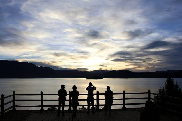 客栈阳台外面 已经日落了~~静静的湖面美极了