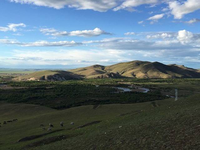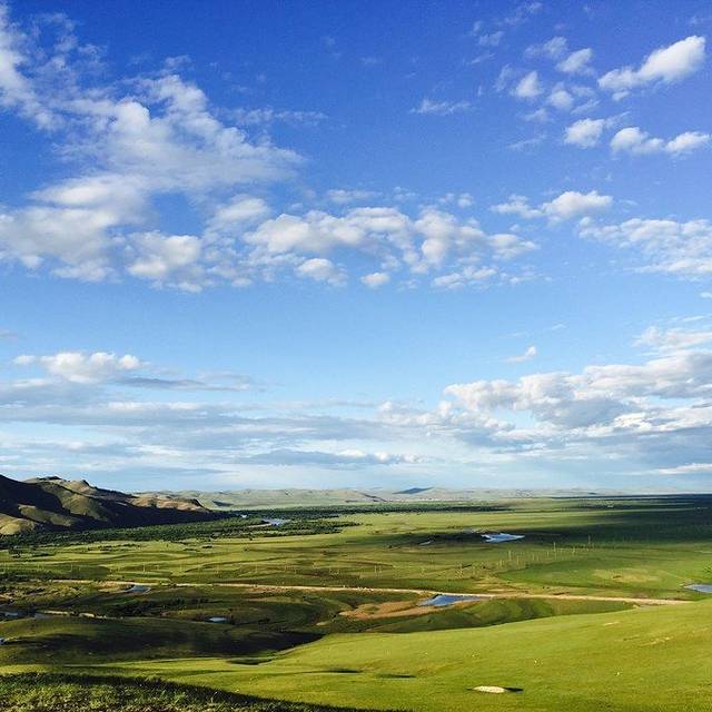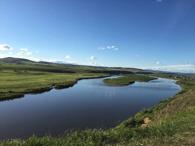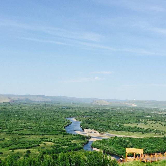 老舍笔下的”天下第一曲水“——莫日格勒河,要从高处看才能看得出是长长弯弯曲曲的河水,就像一条丝带穿过大草原