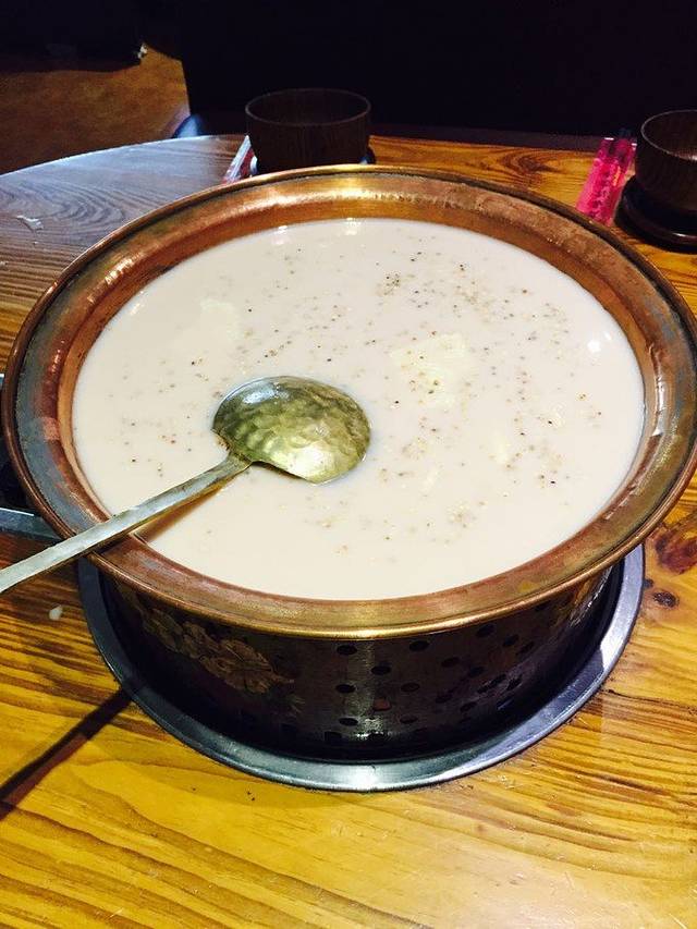 之后包车师傅驱车带我们吃了一家非常正宗的蒙古早点(诺敏塔拉店),她家的奶茶很好喝,闻着很香喝着有点咸咸的,不过一点都不腻,我们点了一大锅,看似很多但最后还是被我们喝完了(因为不想浪费),在这里奶茶他们就当做水来喝,所以不管一个人还是两个人都是这么大锅的,老板娘说这个奶茶要慢慢熬,熬得越久越香