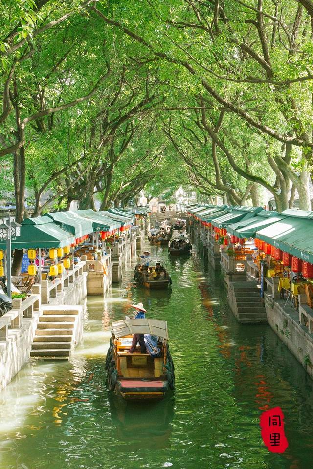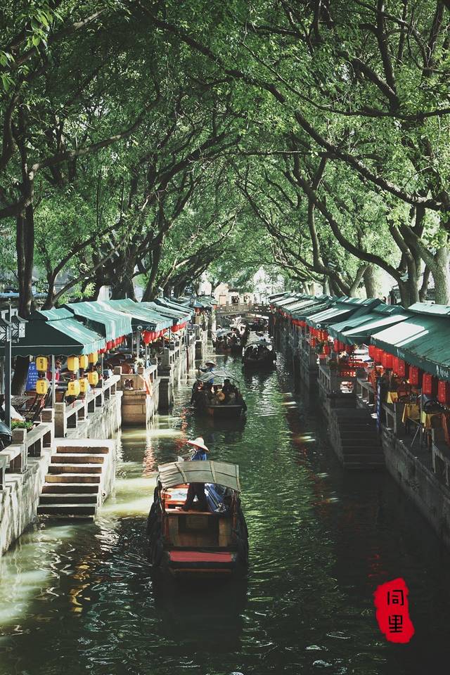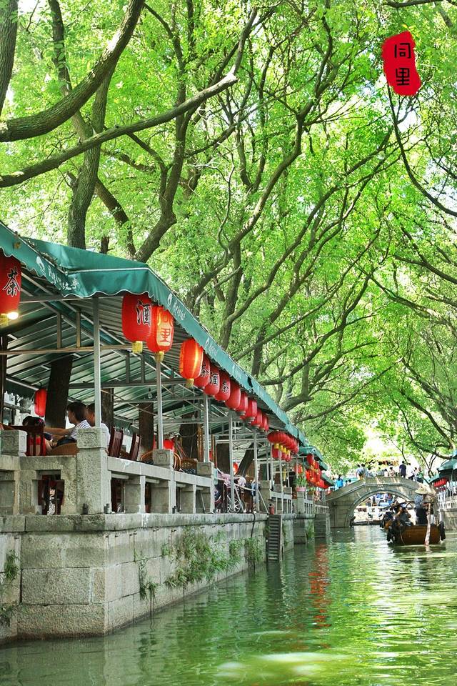 同里的植被是真的丰富茂盛,放眼望去全是清新的绿色。两岸的景象也大有不同,有一种全是挂满了灯笼的餐厅,人们傍湖而坐,看着温柔的水流,吃着地道的同里菜肴。另一种则是满目琳琅的小商店,岸边是来来往往路过的游客。