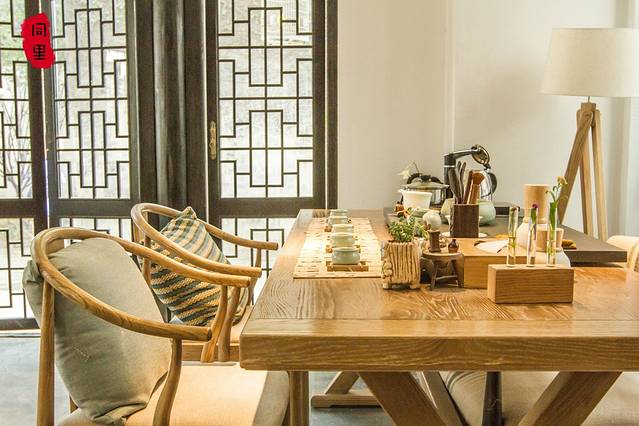 大厅也算是一部分公共活动区域,进门处有一个长方形的茶桌,上面整齐摆放着专业又齐全的茶具,大概是这两天天气太热的缘故,一直没有看到有人在使用,但这块充满禅修气息的区域,给整个花间堂增添了宁静而致远的感觉。