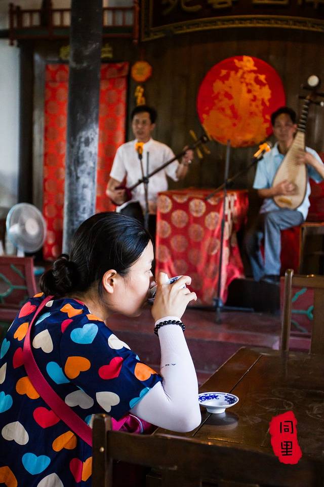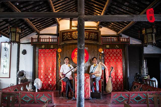 二楼才是喝茶看表演的地方,有昆曲和评弹。环境很好,镂空的窗户都敞开着,外面的树枝时不时会飘进来,几张小桌,客人零零散散坐着品茶看戏,惬意的很。