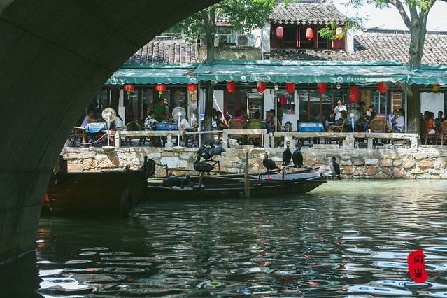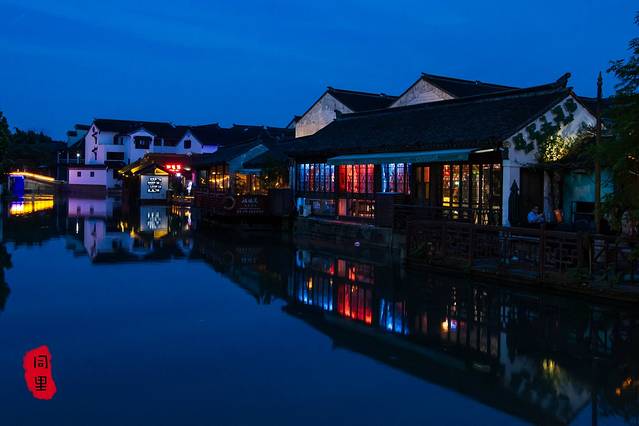 同里只有一条很小很短的酒吧街,还不临水,所以水面一到夜晚就倒映着宁静的江南建筑,只有挂着大红灯笼的那条水路有些热闹骚动,在夜色中吃晚饭的人们大声感叹着这一场好风光。