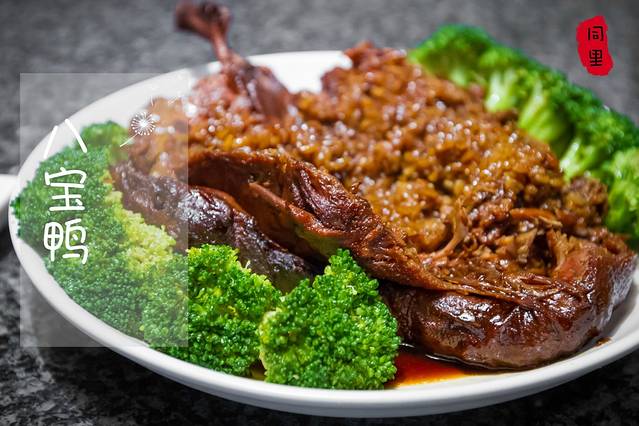 这道菜的卖相其实不怎么好,一只打开的酱板鸭里装满了糯米饭,酱板鸭不是平时吃的湖南那种辣的,而是甜的,里面的八宝饭也是甜的,吃一两口还挺好吃,吃多了会有点腻。
