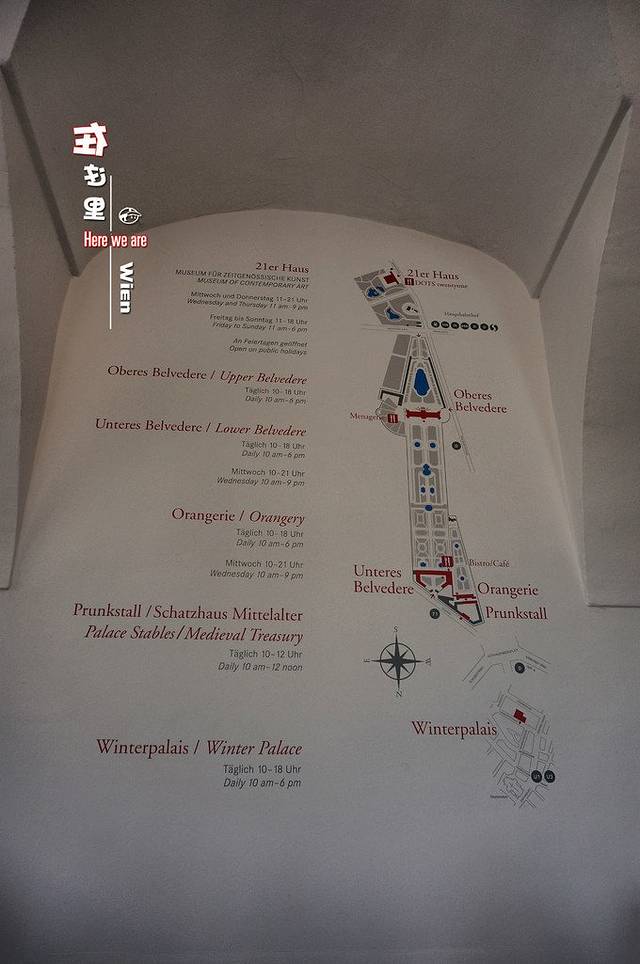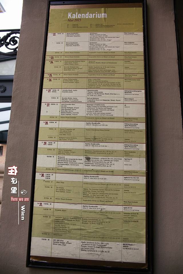 整月的演出表都在这里,售票处告诉我们票都已经卖完了,不过广场那边有很多“黄牛”。这个消息简直是晴天霹雳,我们在维也纳的时间有限,错过了今晚也就没机会了。此次来维也纳有两个目的,一个是大拿骆的音乐会,一个就是我喜欢的《吻》。虽然很失落,但大拿骆还是陪着我去美景宫Belvedere了。