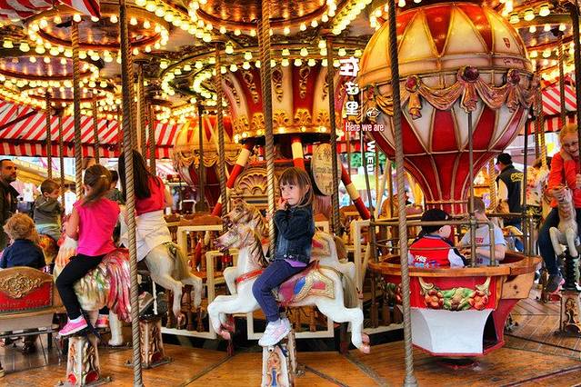 在这么繁华拥挤的广场上,还有一个旋转木马,小朋友们欢乐了。