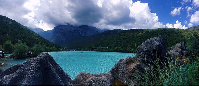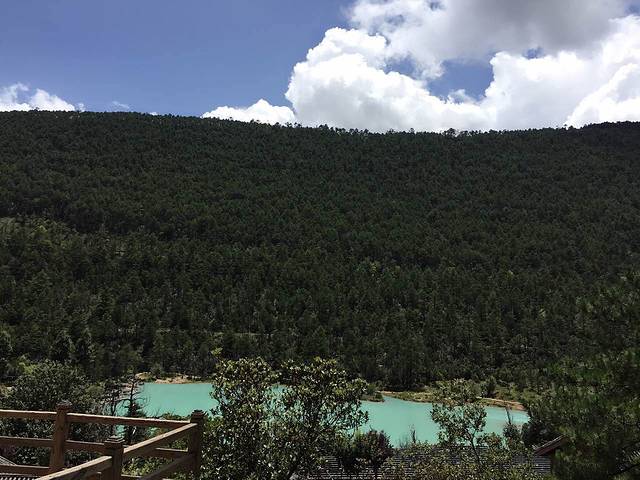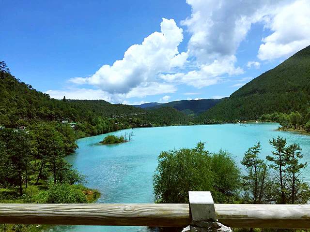 坐班车抵达蓝月湖,在车里就被碧蓝的湖水震慑了。
