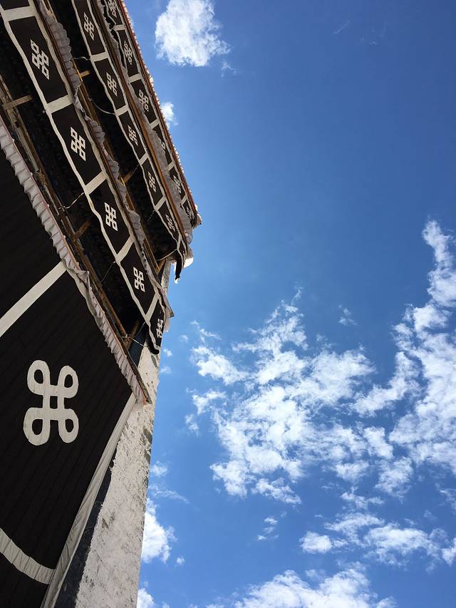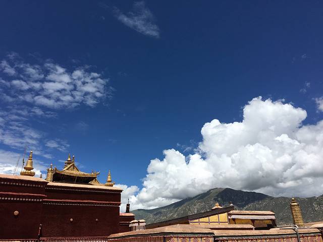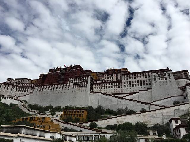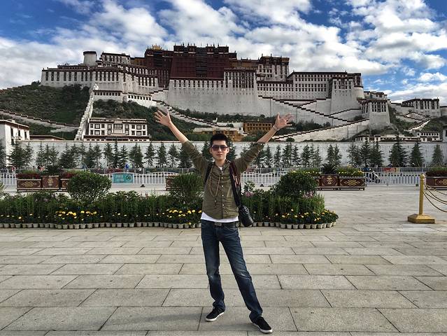 布达拉宫雄伟的英姿高高地矗立我身后,背后是深远的蓝天和洁白的流云。