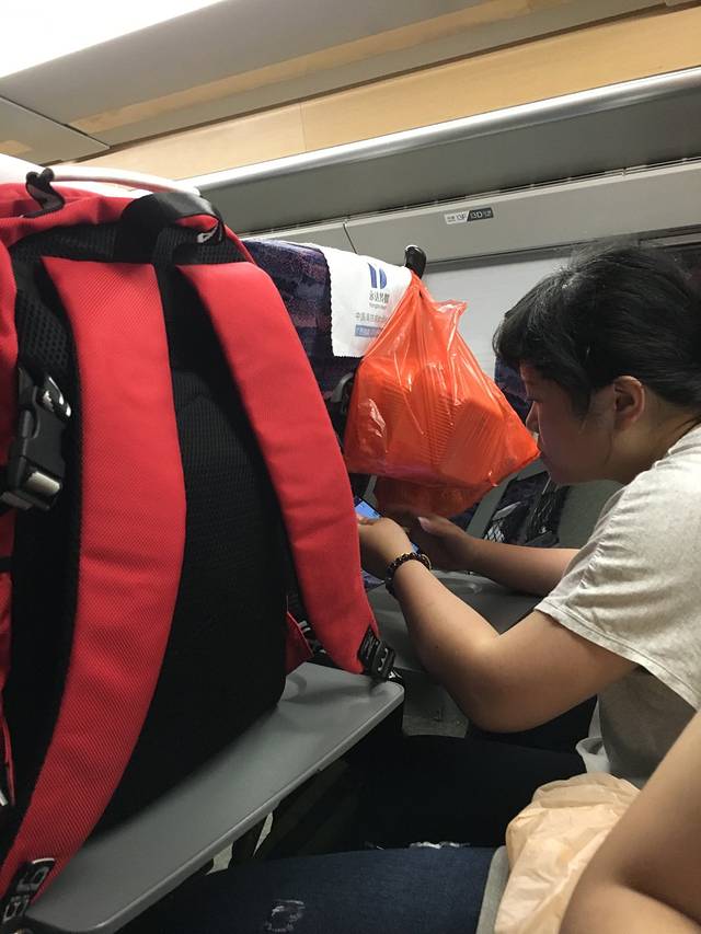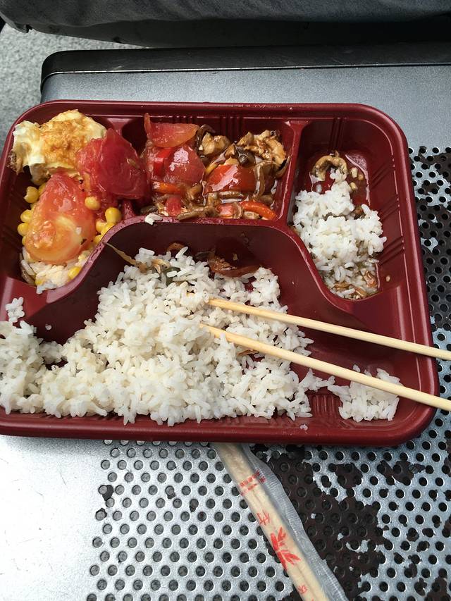 等候时间有点长,候车厅内买了盒饭15/份,三荤一素,比火车上的盒饭实在,这是吃一半了拍的