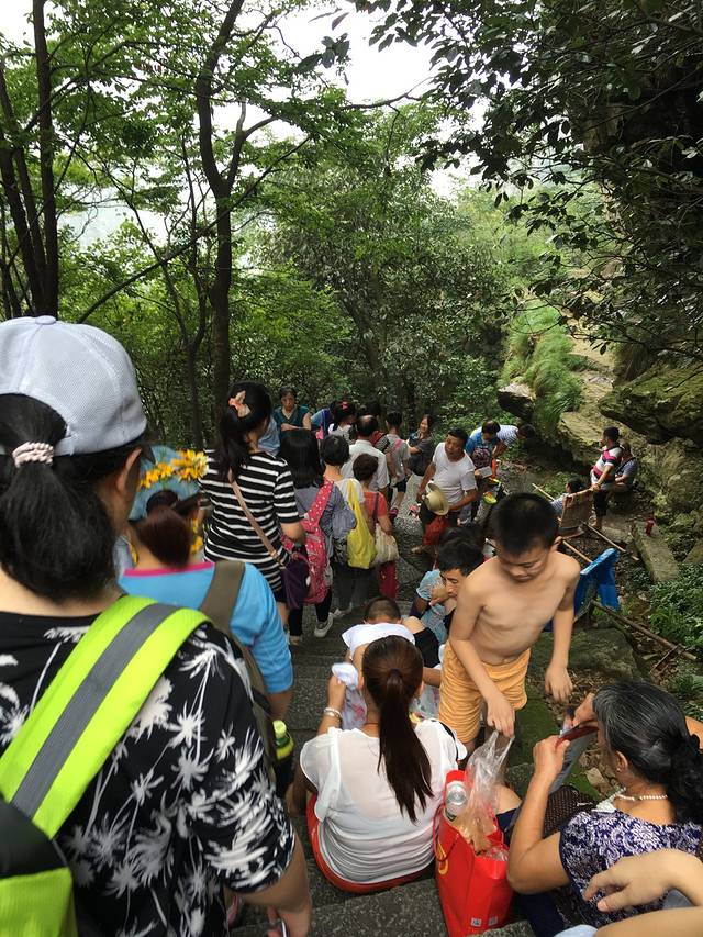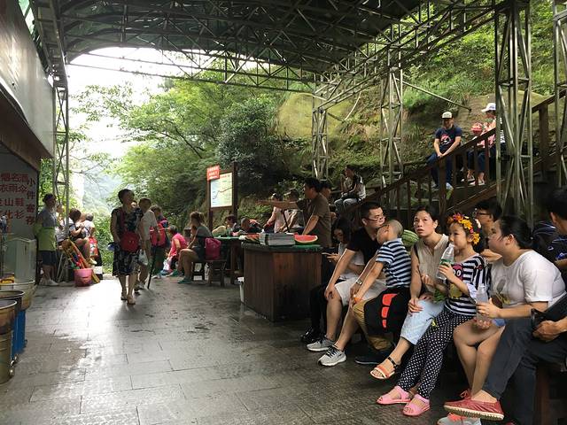 到了缆车处,这里就是准备下楼梯下到三叠泉的路了,很多人在这里吃西瓜,6元一斤,买了1/4个,平均10元/人,比起入口处那种切好了放一个小碗里面卖10元的还是划算的了