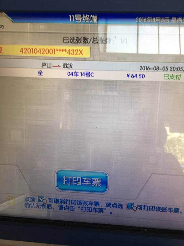 早5:30起床,从汉口滴滴去武昌火车站,因为是一早,6:50已到武昌火车站取好票了,T305车次武昌—庐山7:29发车