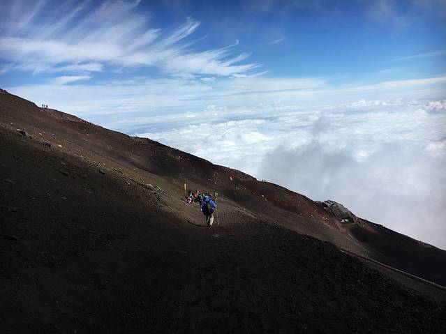 从七合目往上,路过的山小屋就越来越多,不由自主的想休息的意识也越来越强烈,时间逐渐被拖慢,这个时候,身边也有越来越多的人觉得体力不支,呼吸困难