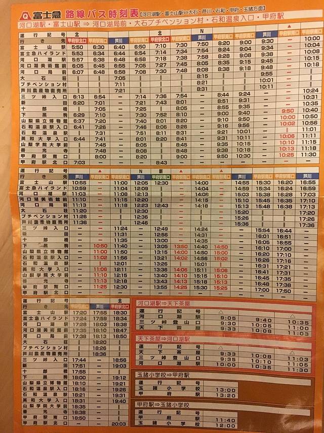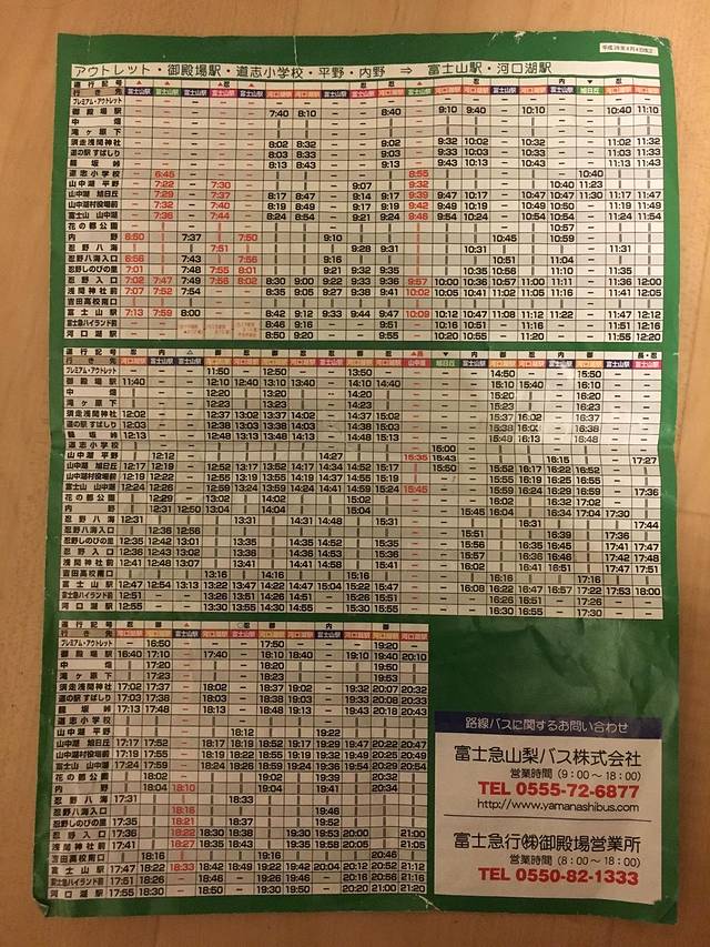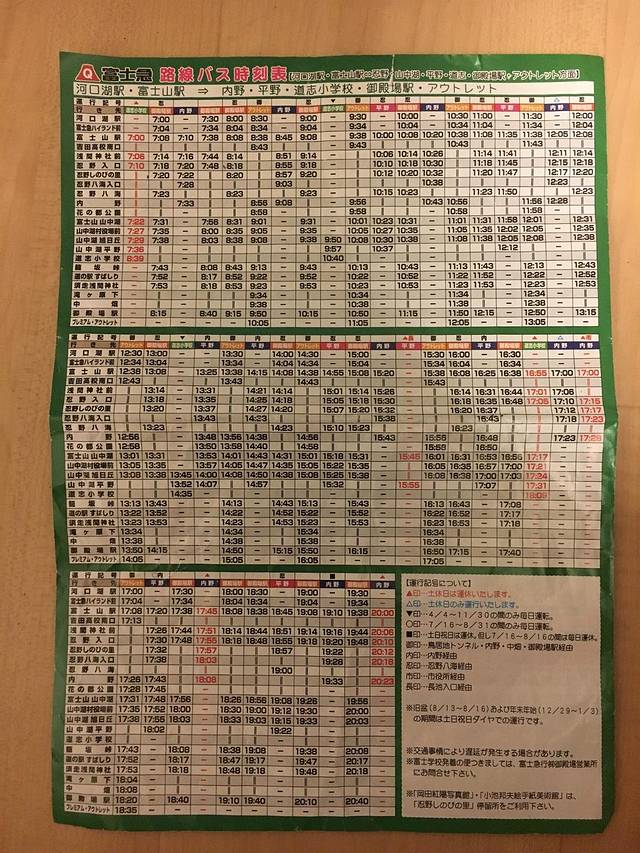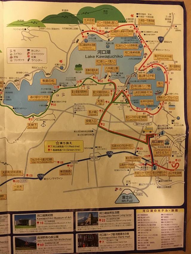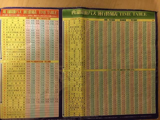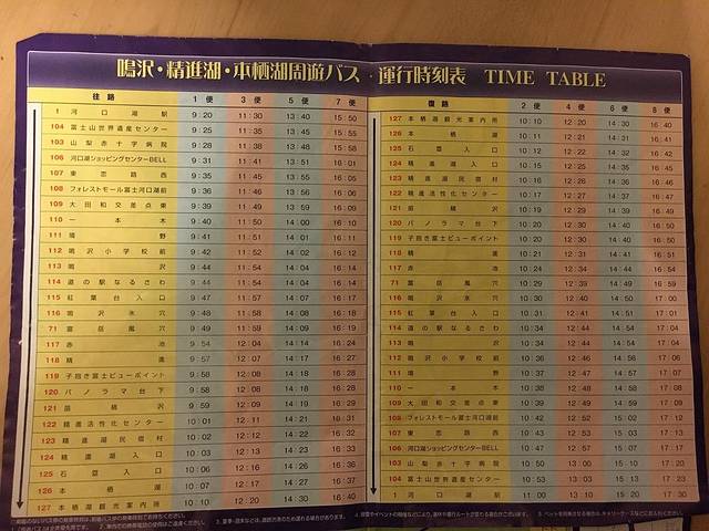 周游巴士一般都是在河口湖站4号巴士站台等车,注意是从后门上车,在后门上车口那有个小机器,要从那里拿整理劵,上面会显示你从哪里上车,然后有一个数字对应,下车交钱时,车前报价的屏幕上会显示数字和对应的价钱,最好是有正好的零钱,不过没有也没关系,车上付款的机器可以换零钱,只要把钱和整理劵给司机就好,如果使用的是PASSMO的话,只要在上车的时候在取整理劵的地方刷下卡,下车时在前门再刷下卡就好,不用取整理劵,值得重视的是,车上每个座椅都会有红色的按钮,在想要下车的时候一定要按按钮,车不会在每个站都停留,有时司机也会开很快,所以在接近你要下的站的时候,一定不要溜号,注意报站时的站名