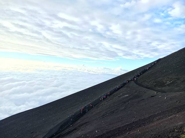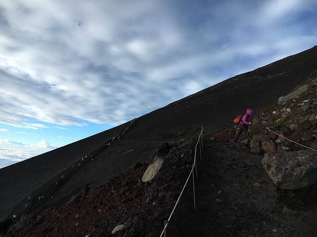 前进,从八合目到本八合目有5个山小屋,这段距离也是最陡的地方,基本只能单人行进,也开始有越来越多的人在路边休息,但因为这时天已经快亮了,所以大家也在保证身体的情况下,开始加快脚步,超过了很多人,也被很多人超过,没有人说话,却一直保持着有秩序的前行