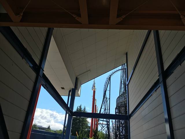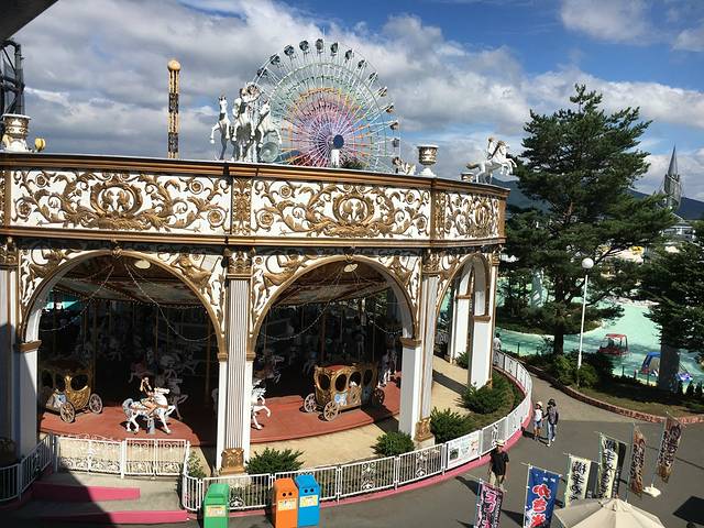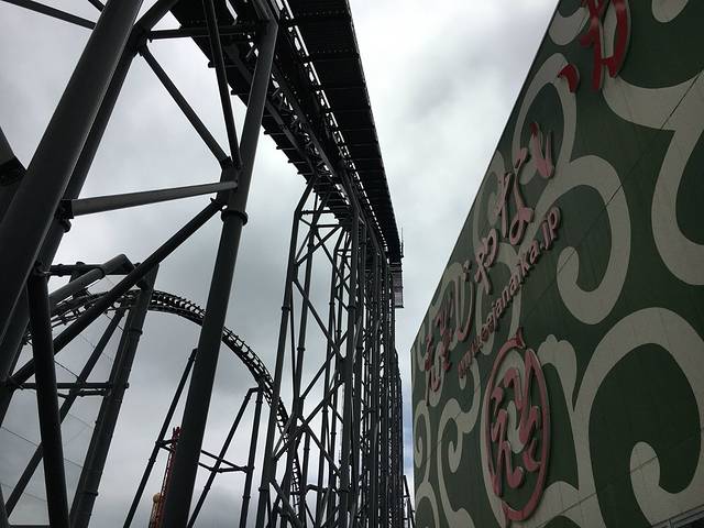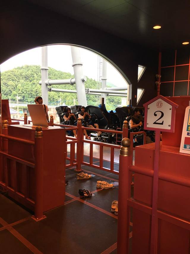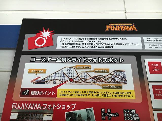 FUJIYAMA在1996年建成时具有最高、最大落差、最长、最快四项世界第一,曾被称为翻滚项目之王。这个项目的厉害之处,就在于它缓慢升高到79米以后,瞬间加速到130km/h骤然落下,然后不断上升下降上升下降,全长2公里的意味是在你上升下降到想吐的时候睁开眼睛会发现还有一半没有走。。。