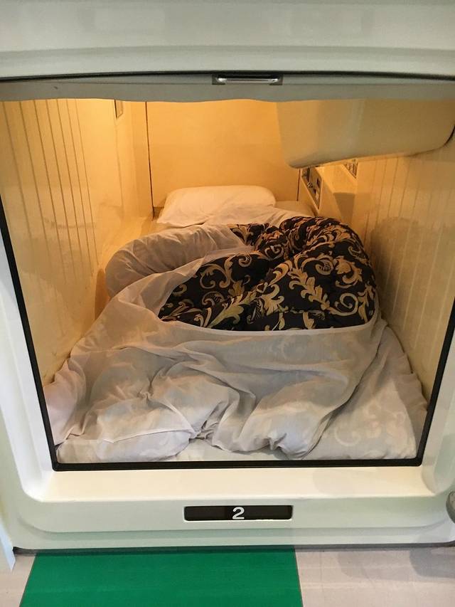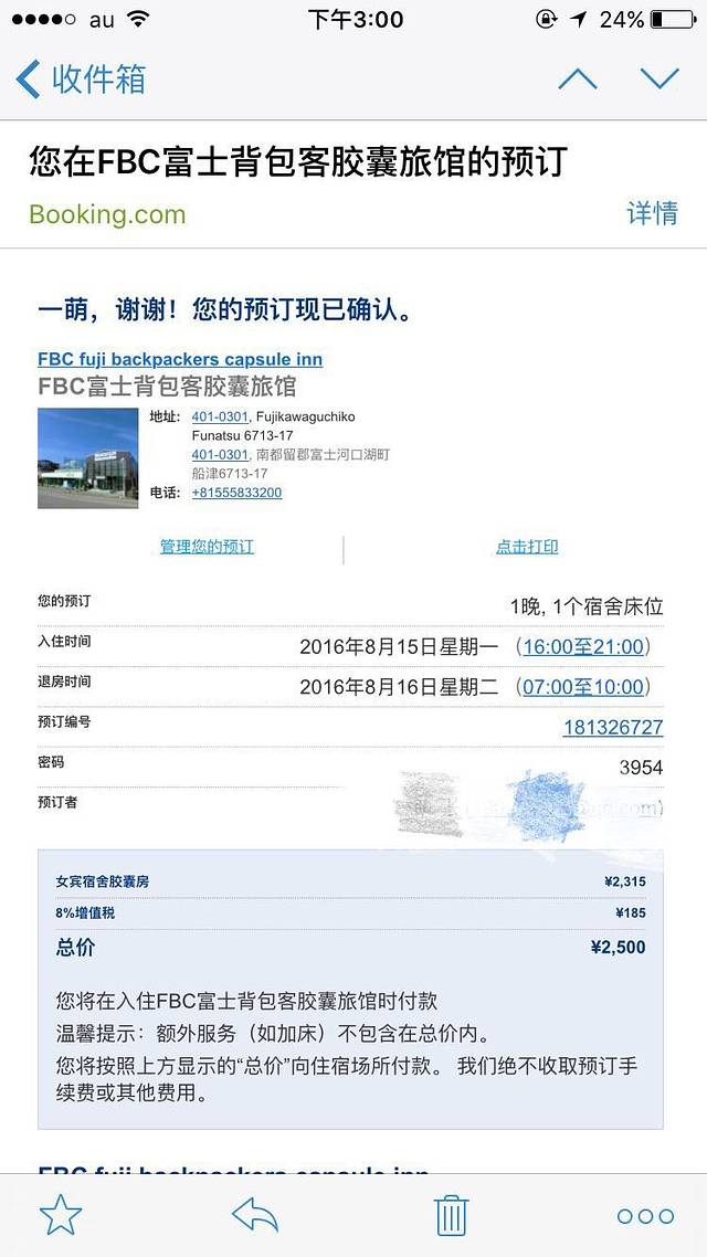 这次住宿依然选择和BOOKING.COM合作的全球青旅预定,国内APP STORE找不到的话可以直接搜BOOKING.COM,这次住的是胶囊宾馆,一晚2500日元,有吹风机可洗澡,但要自备洗漱用品,包括沐浴露洗发精,环境不错,对面就是河口湖,离河口湖站徒步10分钟左右