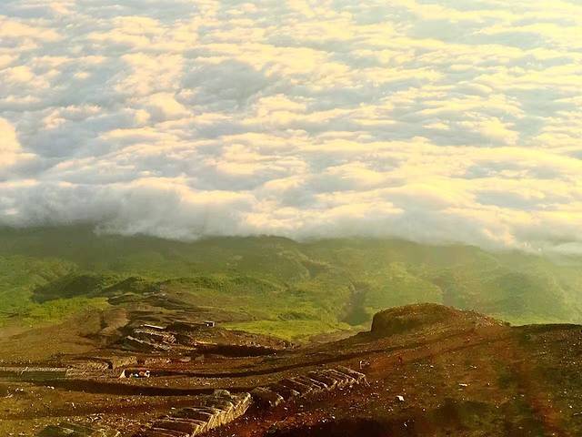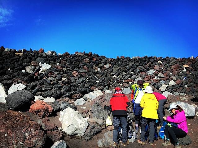 九合目和山顶,真的是咬着牙在完成,这时已经有许多在山上看完日出的人在下山了,心里很着急,走了一夜山路,脚踝非常疼,膝盖也很酸,太阳晒到身上又有暖洋洋的困意,再加上这么高的山上居然还有不知道是不是蜜蜂的蜂!这个时候已经脑子里什么都不想了,可没抬头看一看山顶,只觉得非常近,可是前进的却很慢,路上的人非常多,路也窄而且是Z字形绕来绕去,石头很高,还是要用手攀爬
