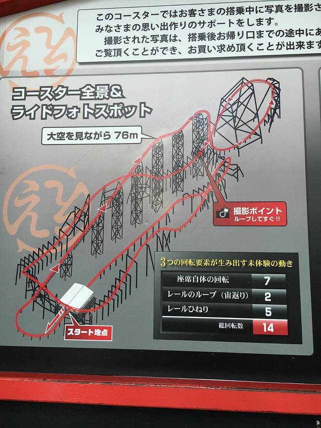 体验的第一个项目就是EEJYANAIKA,徽标是项目名的前两个"え"字一正一倒,意思就是不断翻转翻转,在传统的爬坡、下落、翻转的基础上,作为自身也是可以纵向360°旋转,因此被称为日本第一、世界第二的翻转项目。总翻转数为14次,在吉尼斯世界纪录上写着:"脚在头上面的次数为14次~~~~~~~~~~~"。