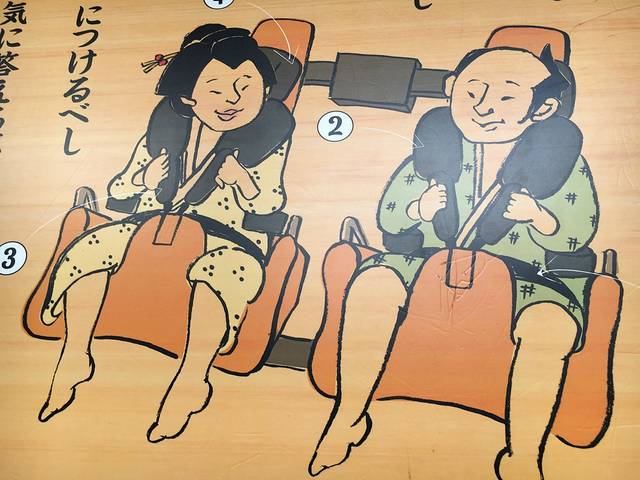 要出发啦,在发车前会有一名工作人员问:“ぐるぐる回るけどええかな~?”(大意:咕噜咕噜的转没问题吧~?),此时所有乘客都高喊“ええじゃないか~!!”(大意:有什么大不了~!!)。然后工作人员开始一边拍手打拍子一边唱“ええじゃないかええじゃないか~♪”(有什么大不了!有什么大不了~♪)